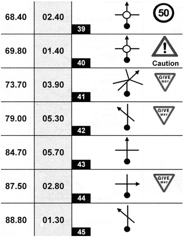 We used a GPS trip-meter app. to measure distance travelled and help us navigate by tulip diagrams. These ‘dot and arrow’ drawings of junctions were first used in the 1950s and indicate which way to turn. Provided the distances between turns are known, navigation should, we hoped, be a ‘doddle’.